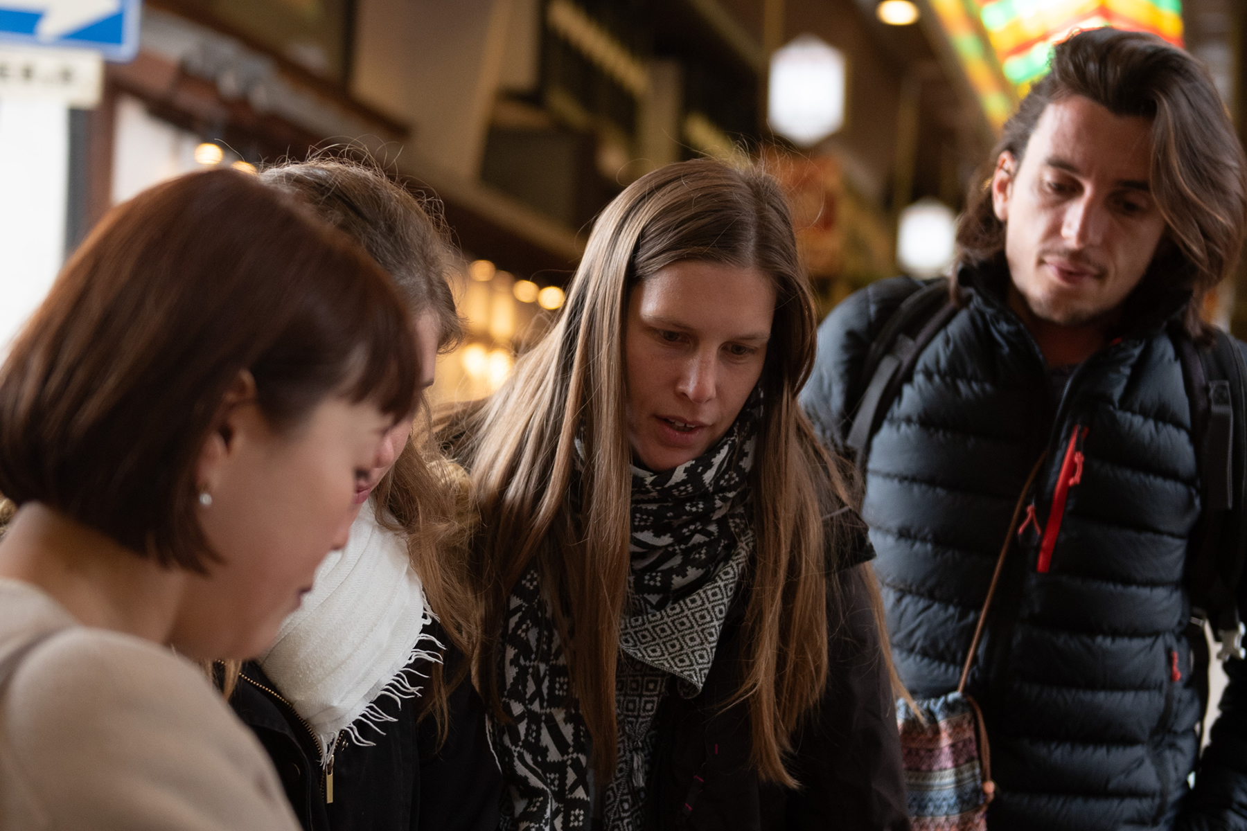 錦市場では無料の試食やショッピングを通じて、市場の躍動感を体感できます。美しい提灯と鳥居の錦天満宮も訪れます。